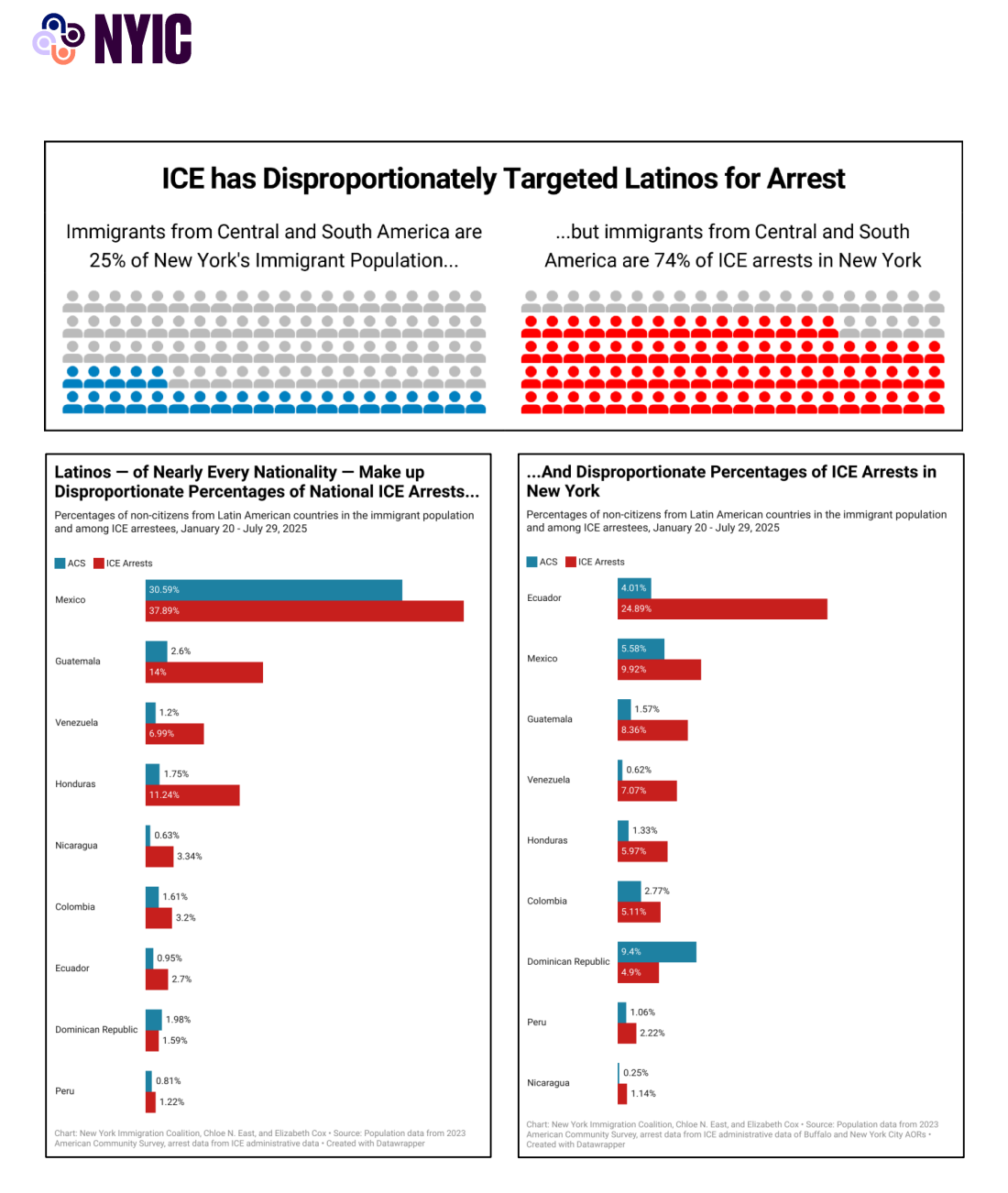 New York has experienced some of the sharpest increases in ICE activity in the U.S. According to a report by CARE coalition member organization, the New York Immigration Coalition, between January and July of 2025, 74% of arrests by ICE were of people from Central and South America, even though only 24% of New York's immigrant population have roots in these regions. An investigation analyzing ICE detention data by NYFocus reveals 2,800 people arrested and detained in upstate county jails during that same time period, up from 500 in all of 2024.